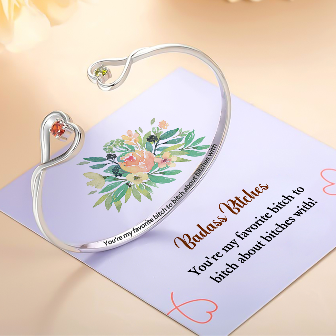 For Friend- Badass Bitches Double Heart Custom Birthstones Bracelet